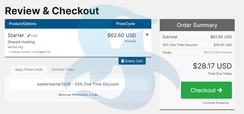 | Starter | 55% 首期一次性折扣 | $2.35/月 | easterstarter2026 |