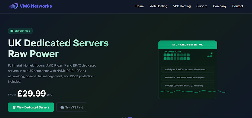 VM6 Networks 是一家英国本土主机服务商,产品线覆盖 UK VPS、独立服务器和 cPanel 虚拟主机。根据其官网公开信息,该平台主打英国节点与高性能硬件组合,常见卖点包括 AMD Ryzen/EPYC 架构、NVMe 存储、KVM 虚拟化和 DDoS 防护,并提供 99.9% SLA 可用性承诺。整体定位更偏向高性能+本地化支持的路线,适合对英国网络落地、稳定性和响应效率有要求的中小型项目作为备选方案。